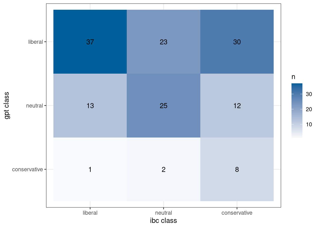 In einem ersten Schritt habe ich die Klassifizierung von Ziems et al. mit dem Beispieldatensatz des Ideological Book Corpus repliziert. Die entscheidende Frage ist, ob das Open Source Modell eine ähnlich gute Qualität wie ChatGPT ausgibt. Das Ergebnis ist vergleichsweise entäuschend: Die Abbildung zeigt deutlich, dass die von dem Modell zugeordneten Klassen (y-Achse “gpt class”) von der manuellen Annotation (x-Achse “ibc class”) abweicht. Die Erwartung sind viele übereinstimmende Klassifikationen, d.h. hohe Werte auf gleichlautenden Klassen. Dem ist aber nicht so. Das Modell macht besonders viele Fehler bei der Klassifizierung konservativer Texte: Viele konservative Texte werden vom Modell als liberal klassifiziert (siehe Zelle oben rechts). Zumindest dieses Modell ist also mit diesen Daten und diesem Befehlsprompt zu Gunsten liberaler Ideologie verzerrt. Ob das auch für Tweets zutrifft?