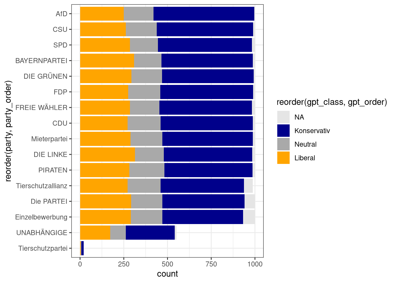 Die Tweets habe ich im Rahmen des Masterseminars M.MZS.12 Multivariate Datenanalyse in 2021 erhoben. Damals haben wir die Anwendung quantitativer Textanalyseverfahren besprochen und hierzu Tweets von Bundesparlamentariern und -parlamentarierinnen gesammelt. Die Tweets sind vermutlich nicht vollständig und von einigen damals aktiven Personen konnte der Twitter-Account nicht recherchiert werden (bzw. der Account war weder auf der Bundestagsseite noch auf abgeordnetenwatch.de verzeichnet). Um die Anwendung eines großen Sprachmodells exemplarisch zu testen, habe ich für jede Partei zufällig 1000 Tweets ausgewählt und durch das Modell die politische Verortung ausgeben lassen.