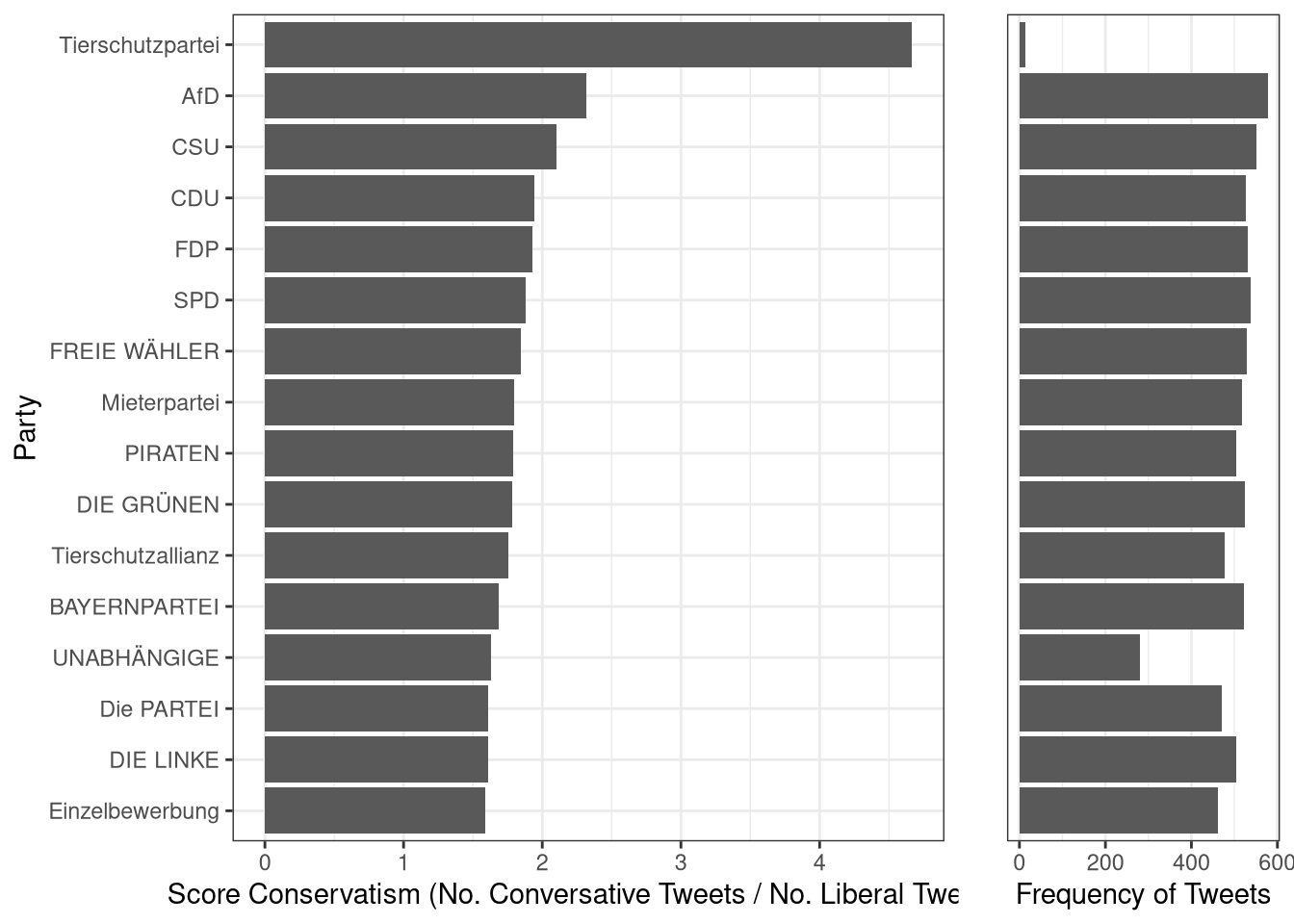 Die Anzahl der Tweets wird auch noch einmal in der nächsten Abbildung auf der rechten Seite abgebildet. Ich habe auch einmal einen sehr einfachen Score für Konservatismus berechnet, in dem die Anzahl konservativ-gelabelter Tweets durch die Anzahl liberal-gelabelter Tweets geteilt wird. Auch wenn der Score (zu?) sehr vereinfacht, entspricht die vom Modell ausgegebene Klassifizierung in der Summe ungefähr der politischen Ideologie der Parteienlandschaft in Deutschland.