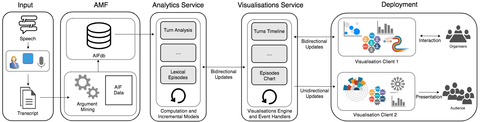 Gold, Valentin, Brian Plüss, Mennatallah El-Assady, Fabian Sperrle, Katarzyna Budzynska, Annette Hautli-Janisz, and Chris Reed. “Towards Deliberation Analytics: Stream Processing of Argument Data for Deliberative Communication” Argumentation and Society Workshop, Computational Model of Argument (COMMA) Conference, pp. 1–3, Warsaw, Poland.