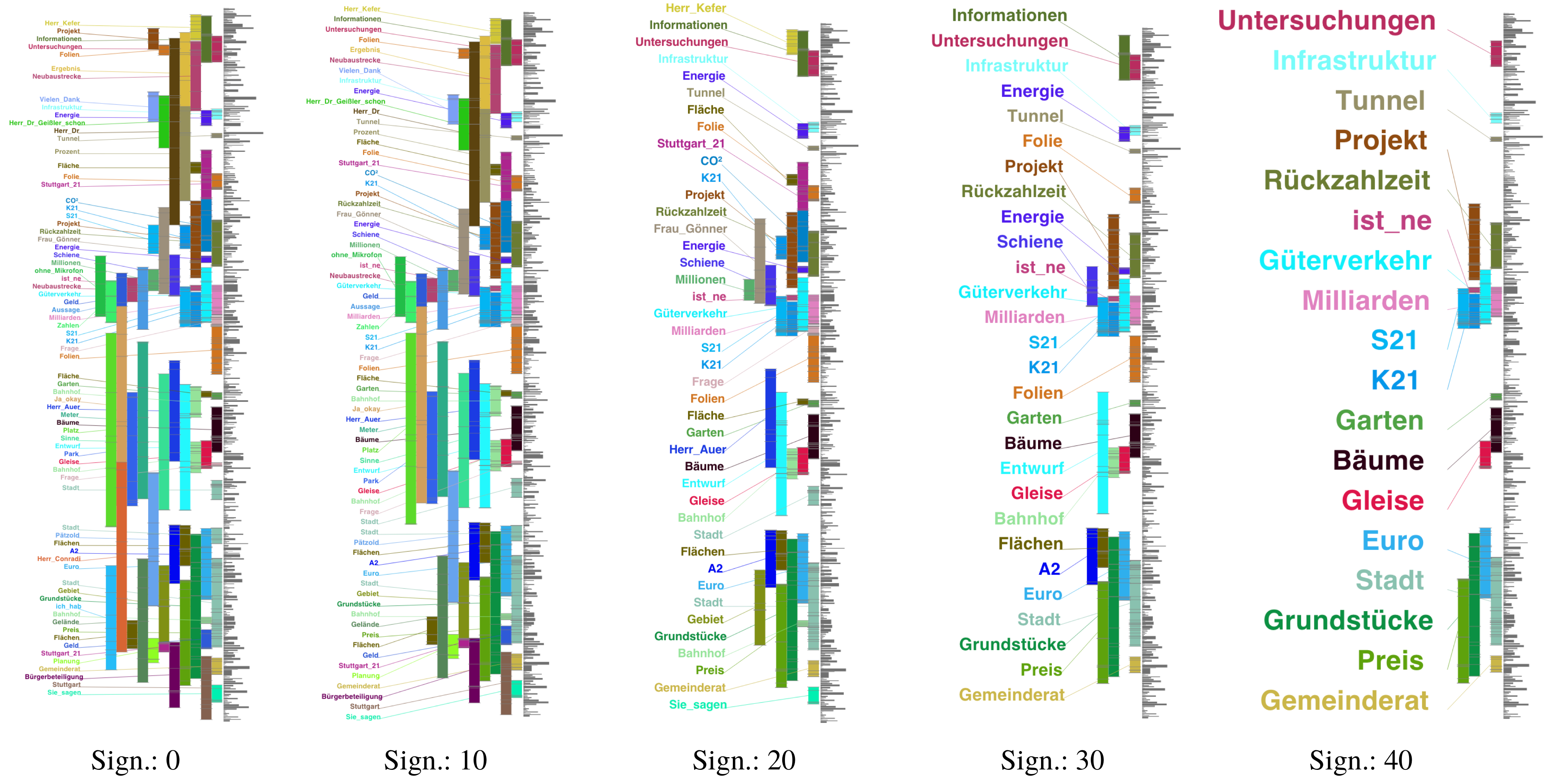 Gold, Valentin, Mennatallah El-Assady, and Christian Rohrdantz. “Explorative visuelle Textanalyse von politischen Debatten” In Blätte, Andreas, Joachim Behnke, Kai-Uwe Schnapp, and Claudius Wagemann (Eds.), Computational Social Science. Die Analyse von Big Data, pp. 211–234, Nomos, Baden-Baden, 2018.
